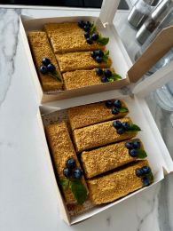 Пирожные получились потрясающе вкусными! У меня получилось 5 штук, больших и сытных. За 3 часа в холодильнике всё великолепно пропиталось, пирожные прямо тают во рту. У меня приготовление заняло немало времени, но проблем с тестом не было, так как я раскатывала его на силиконовой коврике и силиконовой скалкой:) ничего никуда не прилипало, и никакой лишней муки не понадобилось. В тесто добавила чуть больше 250 г муки. Пирожные вышли не приторными, очень вкусными. Спасибо за такой прекрасный рецепт, Настя, обязательно побалую свою семью этими мини-медовиками ещё не раз:)