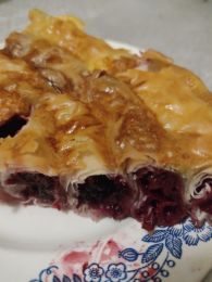 Только что испекла этот пирог. Мне очень понравился! Форма была большая, ушла почти вся пачка теста фило без 1 листа и пакет замороженной вишни. Вишню предварительно не размораживала, а так как сливок у меня не было, заменила на пачку крем-чиза. Вышло замечательно! Спасибо за такой простой и вкусный рецепт, наверное, станет одним из моих любимых пирогов.