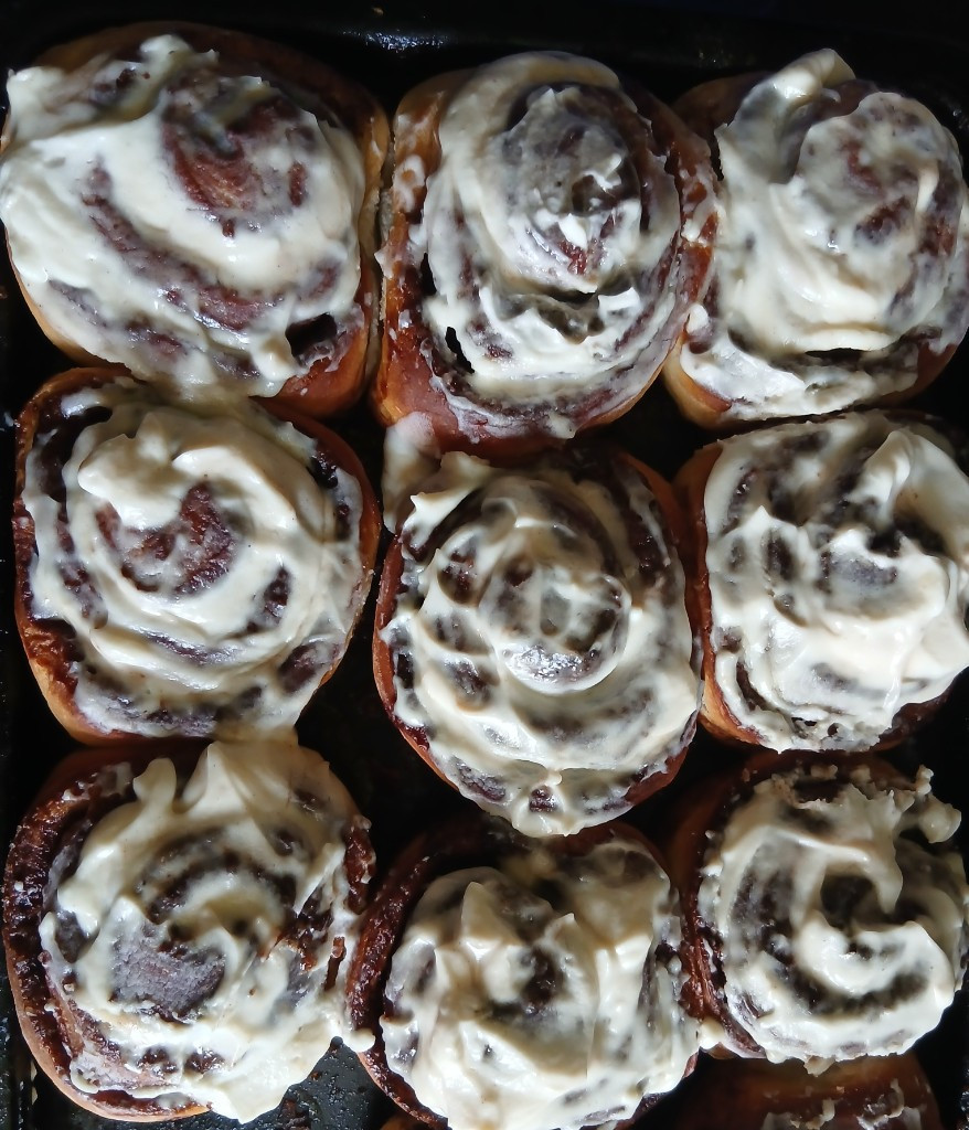 Испекла булочки) Получились очень вкусные, ничем не уступают настоящим булочкам Синабон) С тестом приятно было работать, только нужно очень хорошо защипывать, чтобы булочки не разворачивались) Пекла 18 минут) Несколько булочек заморозила, потом разморозила за 2 минуты в микроволновке, и свежеиспеченные булочки готовы)