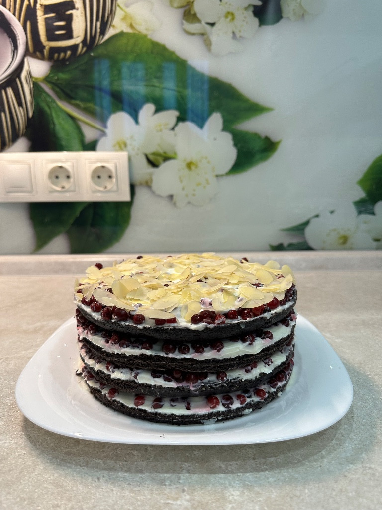 Этот торт стал одним из моих самых любимых. Единственная сложность при приготовлении — разрезать коржи, они и так получаются тонкими. Но вкус и внешний вид торта просто восхитительны. Брусника дает кислинку торту, а шоколадые коржи пропитываются сметанным кремом и становятся сочными и нежными.