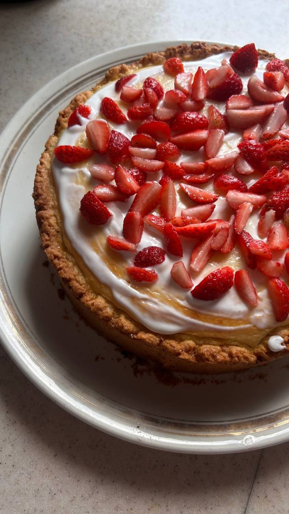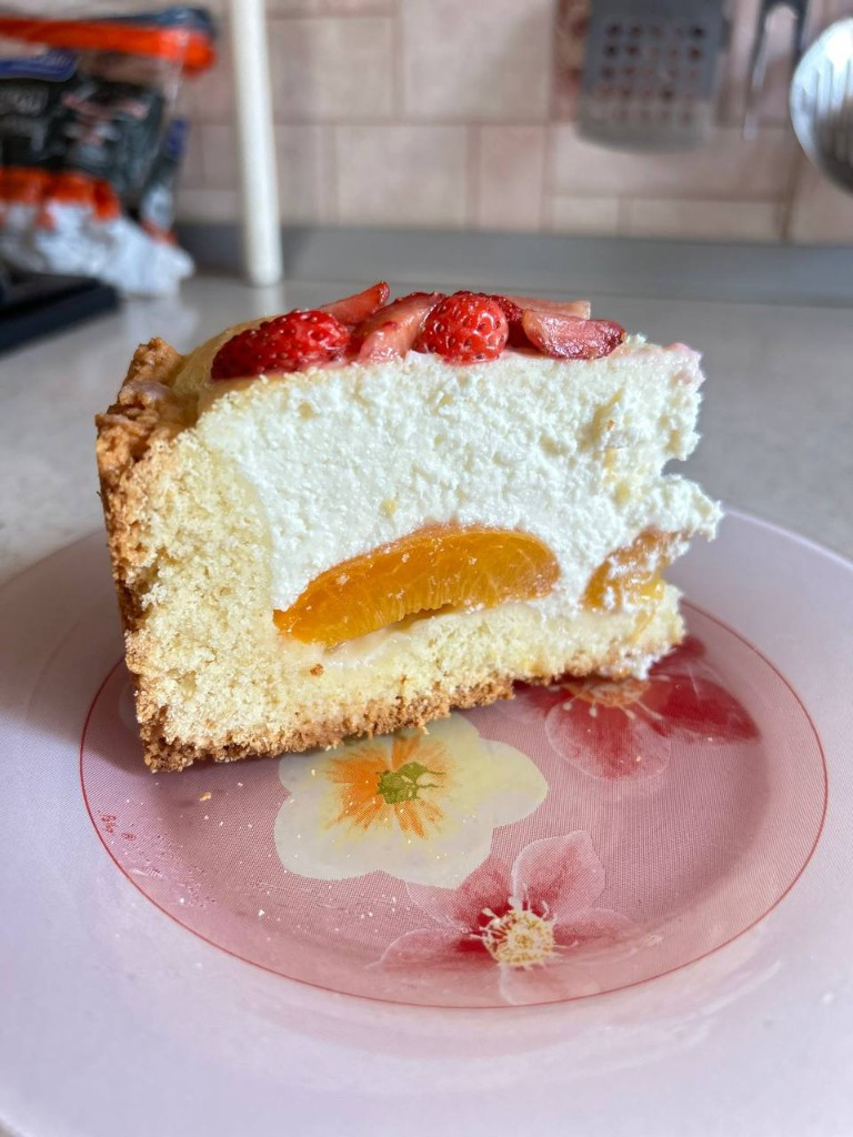 Пирог получился потрясающий. В меру сладкий. Сверху украсила клубникой и получилось ещё красивее