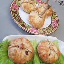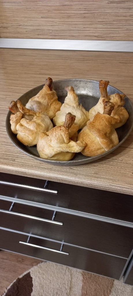 Только что достала из духовки..Начинки осталось много, но она идеальна как гарнир.Ножки, покосились слегка и нитки видимо надо было брать кулинарные, специальные…Но вообще вкусно, оригинально.