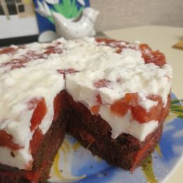 Как и обещала, отчитываюсь, что получилось утром: торт вытряхнула из формы, половина вышла прекрасно, вторая половина насквозь пропиталась и плюхнулась на первую (корж оказался чуть тоньше). Получилось слишком сладкая, красно-шоколадная жижа. Попробовала, выбросила. Повторюсь: эффектный и простой, торт этот не терпит спешки. И мстит залитым соком холодильником, если его утром вытряхнуть из формы и оставить на подставочке на полке.:) В выходные переделаю его снова, не люблю, когда что-то не получается.))