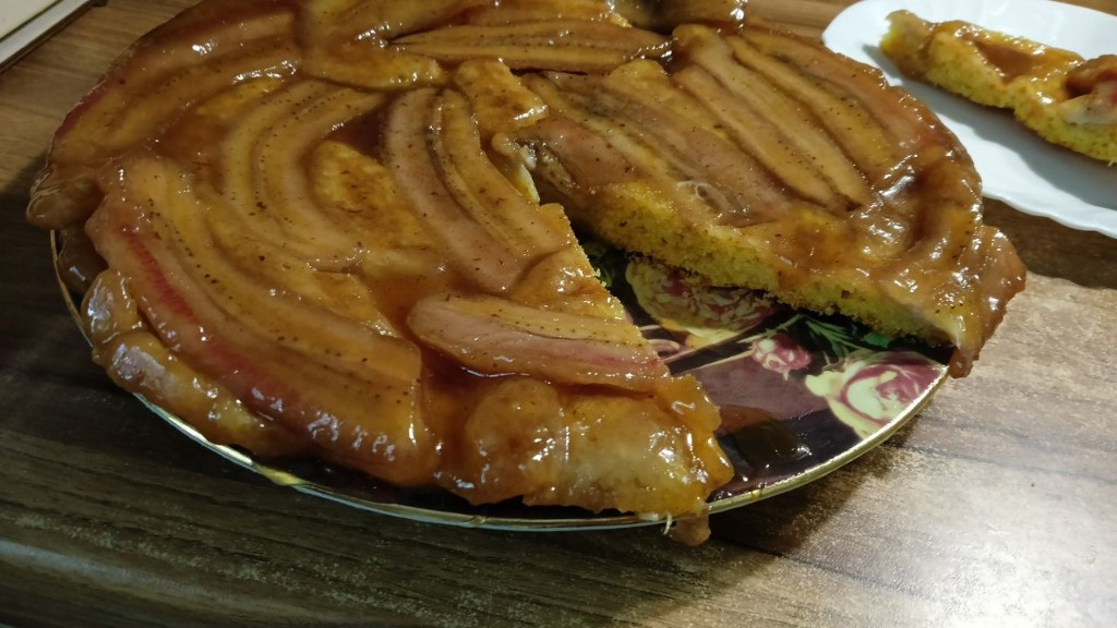Я использовала сковороду, в которой можно запекать в духовке. Если такой посуды нет, можно сделать карамель, перелить ее в форму для запекания, выложить бананы, выложить тесто и отправить в духовку.