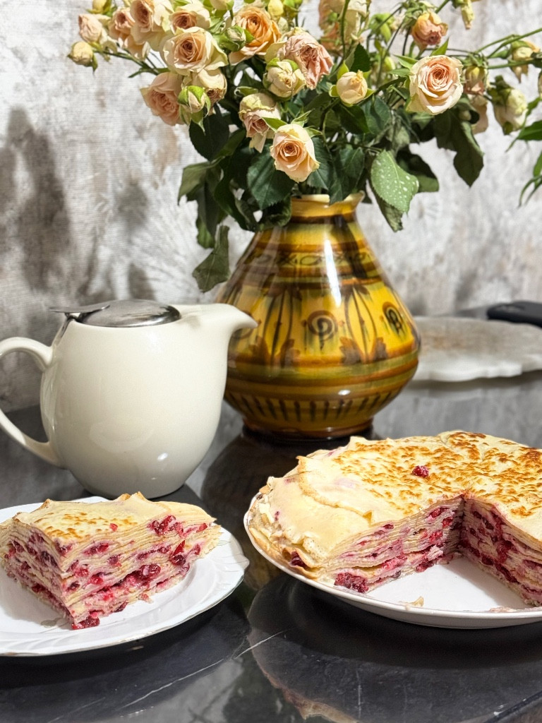 Тортик получается очень вкусный. Советую использовать густое сгущенное молоко, смазывать блинчики тонким слоем. Вместо брусники можно использовать вишню.