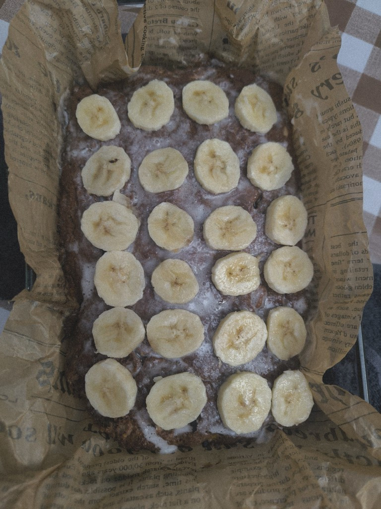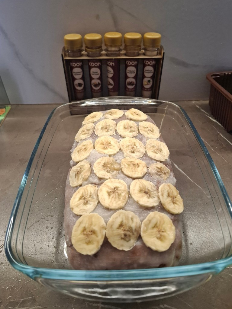 Я полила кекс сахарной глазурью и украсила нарезанными бананами.