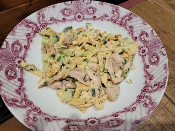 Вкуснейший салат! Я решила совместить яичные блинчики и вареные яйца, получилось очень вкусно. Вареные яйца придают вкус и кремовую структуру, а яичные блинчики — нежность.