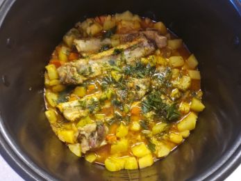 Сегодня приготовила рагу из свиных рёбрышек с овощами.Получилось очень вкусно. Готовила в мультиварке.