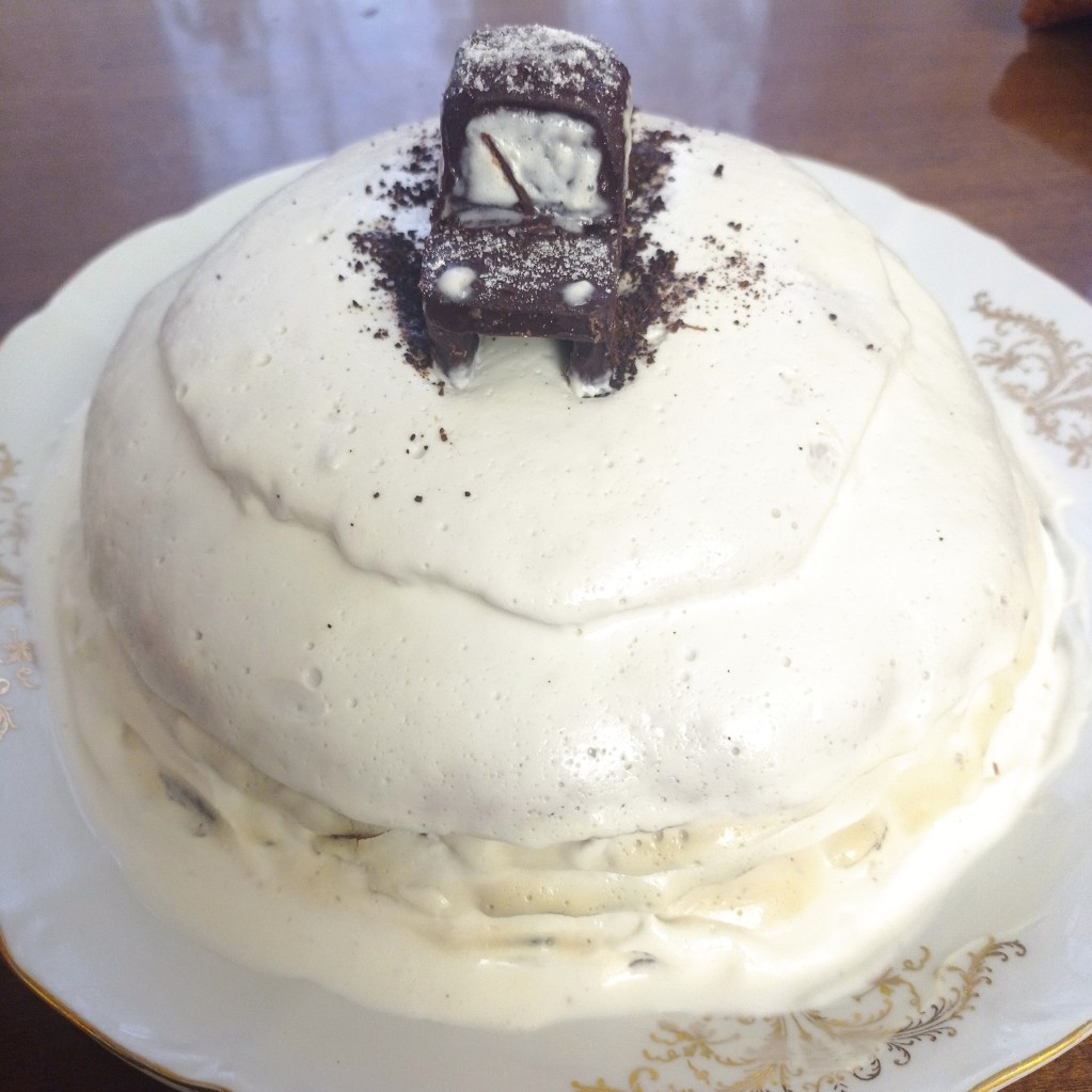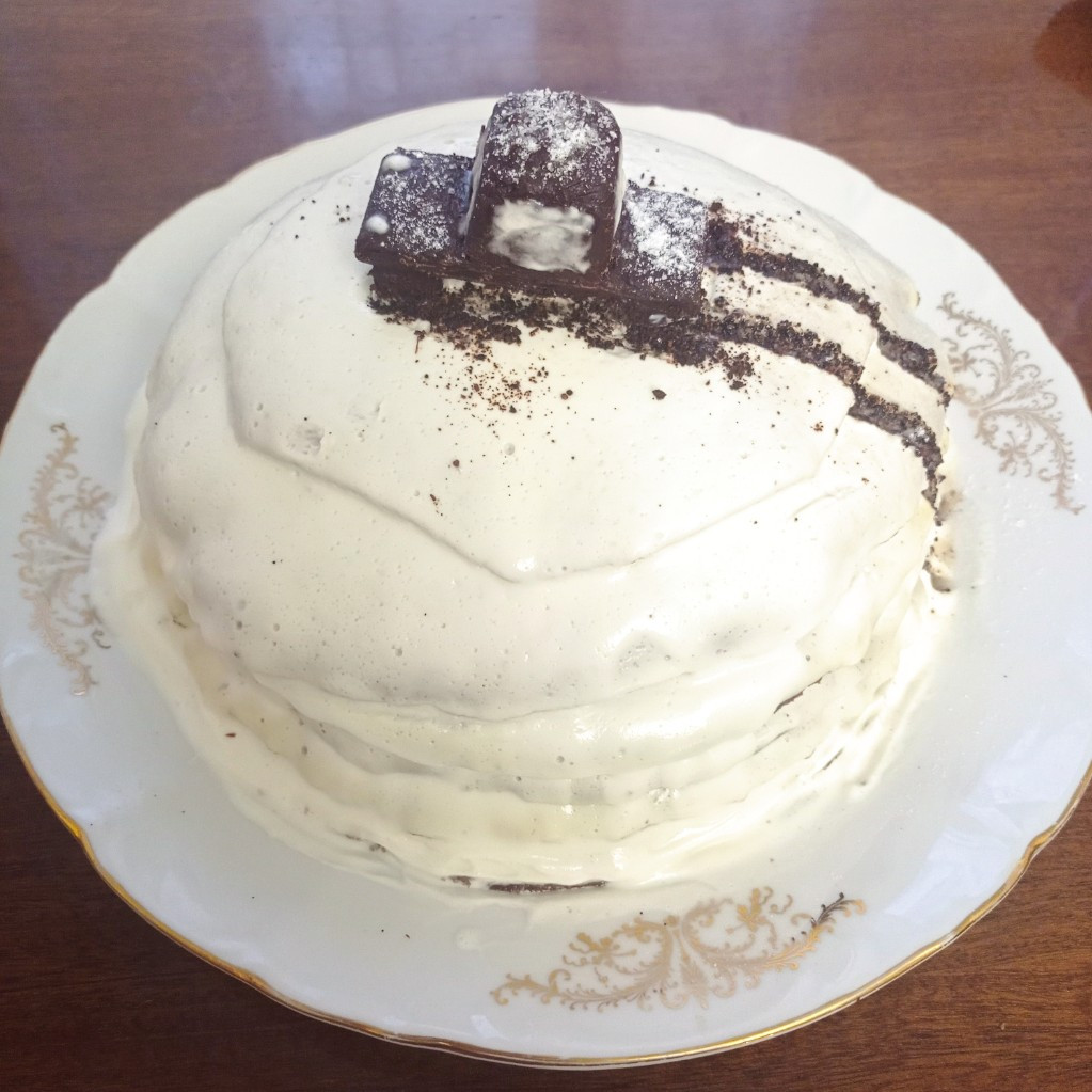 Мне тоже очень нравится этот торт !!! Я бисквит поделила еще на 2 части и добавила между ними крем чиз ! А все остальное по рецепту, правда еще не посыпала шоколадной крошкой , но это успеется всегда
