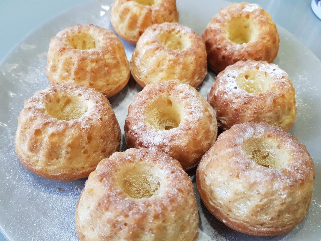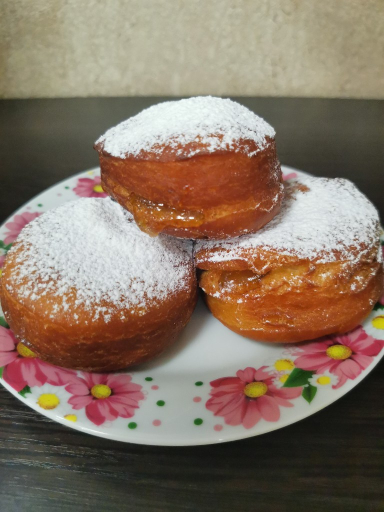 Вот как-то так… Пересчитала ингредиенты на 2 желтка, вырезала формой d 8 см. Получилось 10 крапфенов. Много. Надо было начать с 1желтка,😁 Джем абрикосовый.