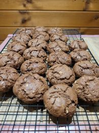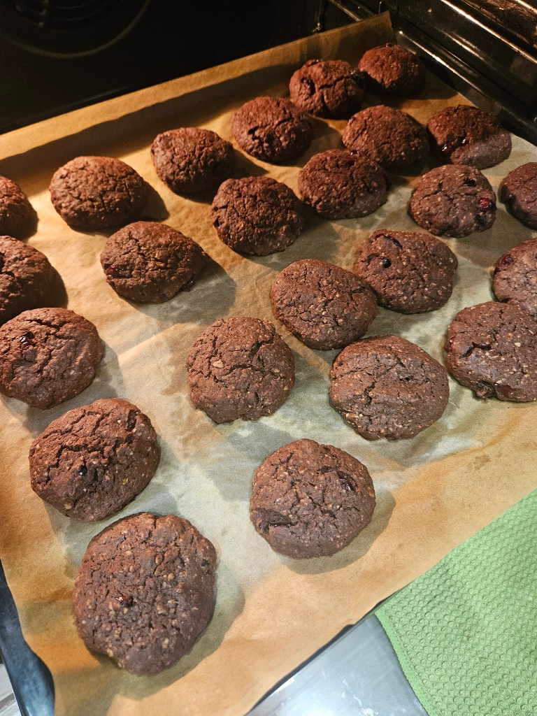 Пекла с вяленой клюквой. Получилось 26 штук по 30 г. Выпекала 15 минут. Наверно разрыхлителя надо было поменьше — печенье с трещинками. На вкус это не влияет, поэтому просто сделаю себе пометку 😁. Сахар убавлять, на мой вкус, не стоит — печенье умеренно сладкое. Я, пожалуй, еще и сахарной пудрой посыплю… 😁