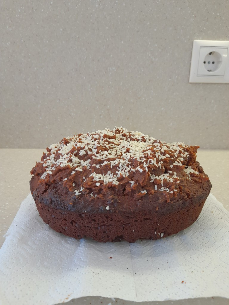 Приготовила кекс.Очень понравился. Верх помазала оставшейся сгущенкой и посыпала сверху кокосовой стружкой.