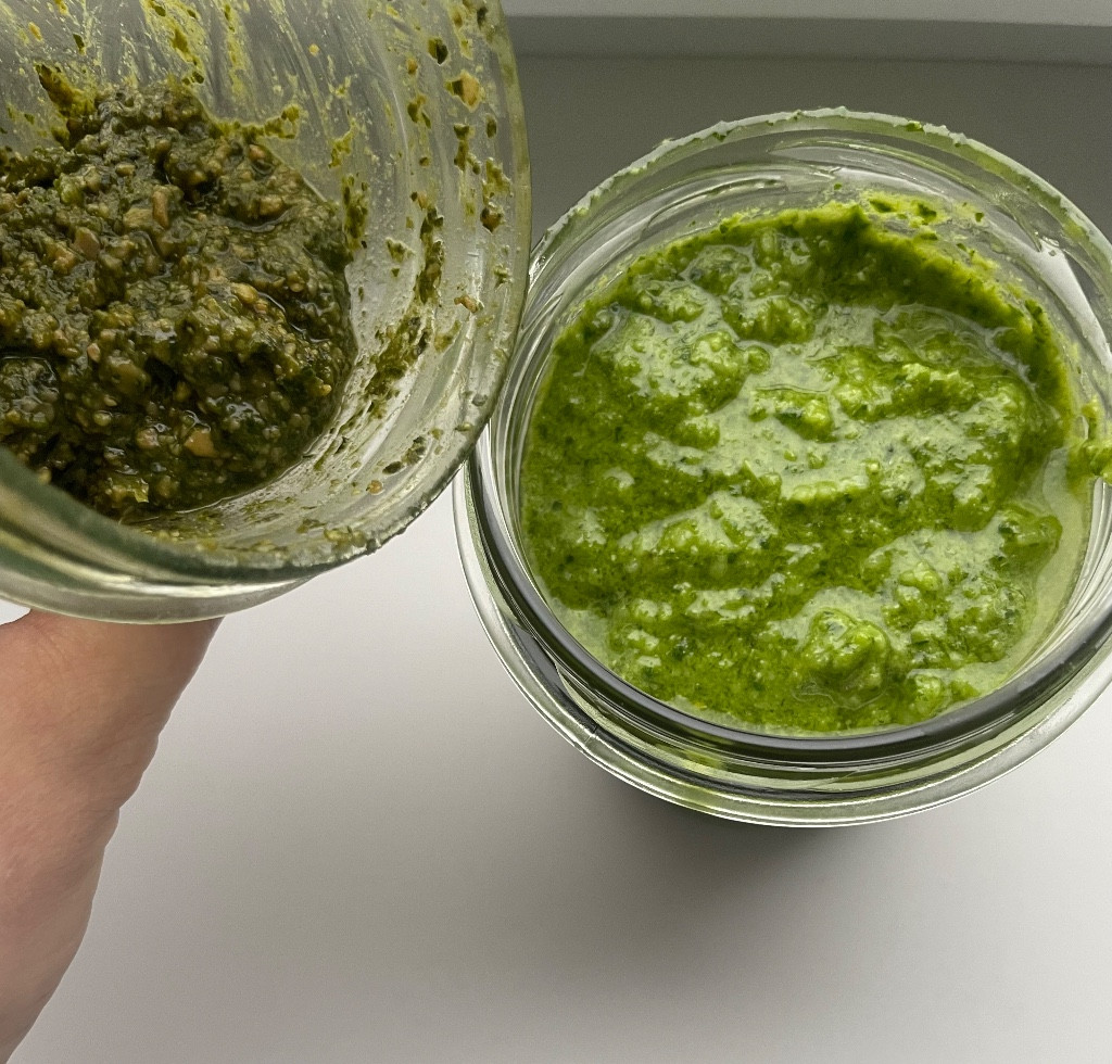 А я снова с фотоотчетом – теперь сделала из зеленого базилика и с кедровыми орешками. Цвет явно отличается (сравнение на фото). Вкус не то чтобы сильно – но некоторая разница есть: зелёный базилик отличается не только цветом, но и ароматом, и листочки у него маслянистые, в отличие от фиолетового. Ну и цвет – просто праздник для глаз👍🏼🌱